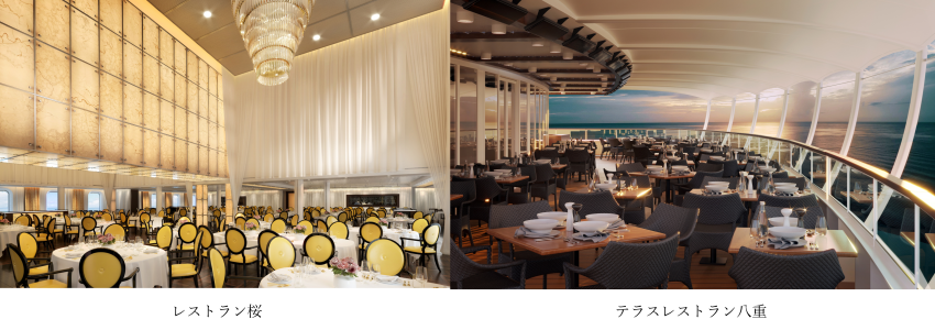 「テラスレストラン八重」では季節や寄港地の食材などを取り入れたお料理を、ビュッフェスタイルでご提供いたします[1]。和食に加え、洋食やアジア料理など、地球を何周も航海してきたシェフだからこそ生み出せる、豊かなメニューの数々を日替わりでご用意いたします。お好きな量をお好きな味で目の前で調理するライブキッチンを実施するスペシャルコーナーも設置いたします。船の最も後方に位置するテラス席で、移りゆく海と空とともにお食事をお楽しみください。