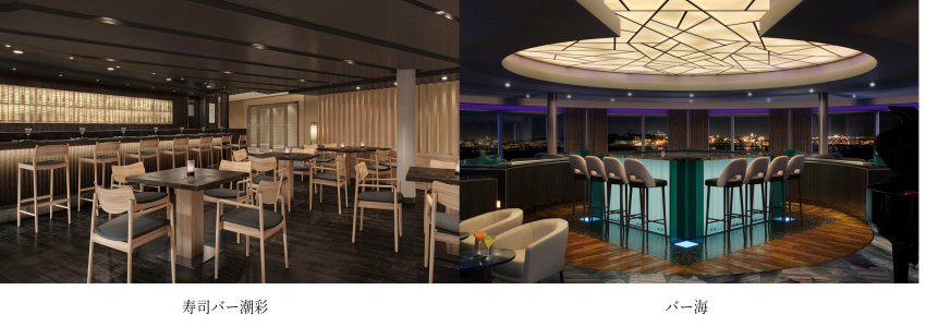 また、船内にはカウンター席とテーブル席の双方を備え、お寿司や小皿料理、日本酒をお召し上がりいただけるスペシャルレストラン「寿司バー潮彩」をご用意いたします[2]。数貫のお寿司を気軽に味わうことも、シェフとの会話を楽しみながら、ゆったりとしたひとときをお過ごしいただくことも可能です。夕食後はバーとしても営業し、隣接するオーシャンクラブ&バーで行われるライブやエンターテインメントに日本酒やカクテルで華やぎを添えます。