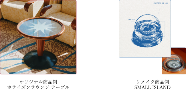 販売商品の種類は大きく2種類をご用意します。1種類目はにっぽん丸で実際に使用されていた品々を、そのままの形でオリジナル商品として販売するメモリアルグッズです。実際に船内のホライズンラウンジで使われてきたテーブルなどを含む35年以上の長い航海