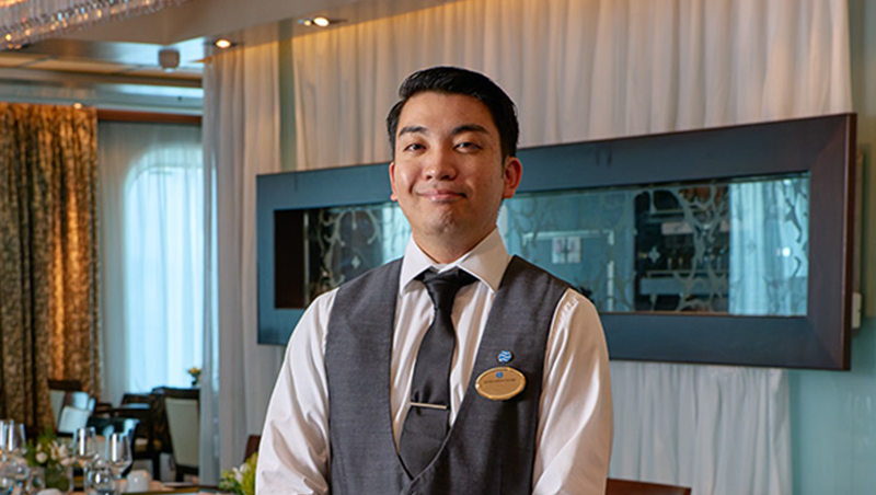 ホテルサービスクルーとして、現在はMitsui Ocean Fujiの船内レストランにてウェイター業務を担当しています。お客様は船内のアクティビティや寄港地先での観光に加え、食事も非常に楽しみにされています。その期待に応えるため、記憶に残るおもてなしを実現し、最高の感動体験を提供することが私たちの使命です。
