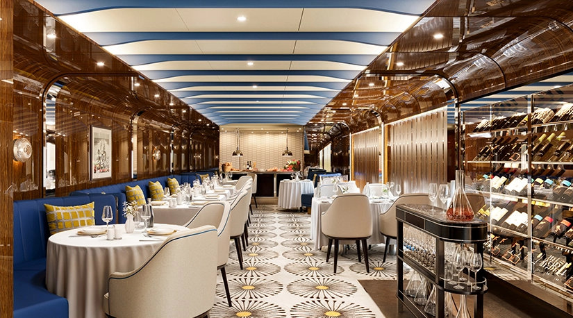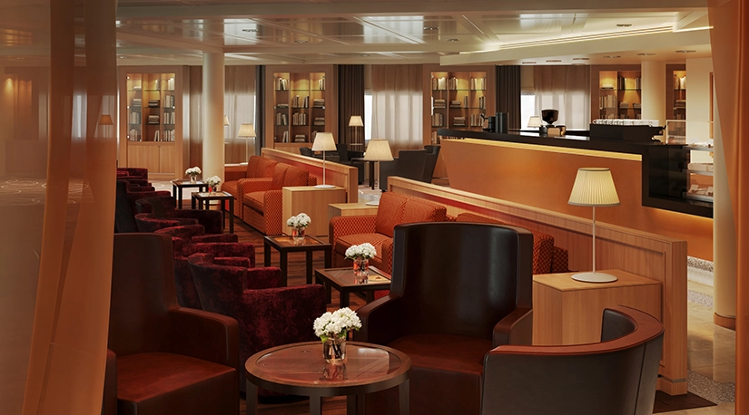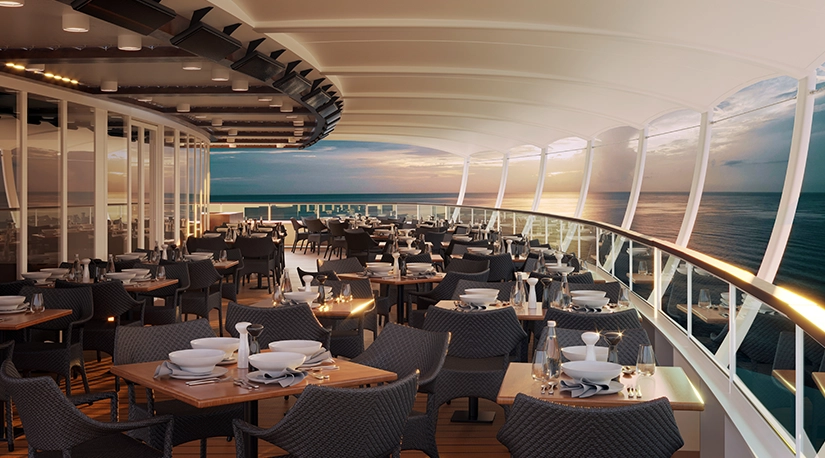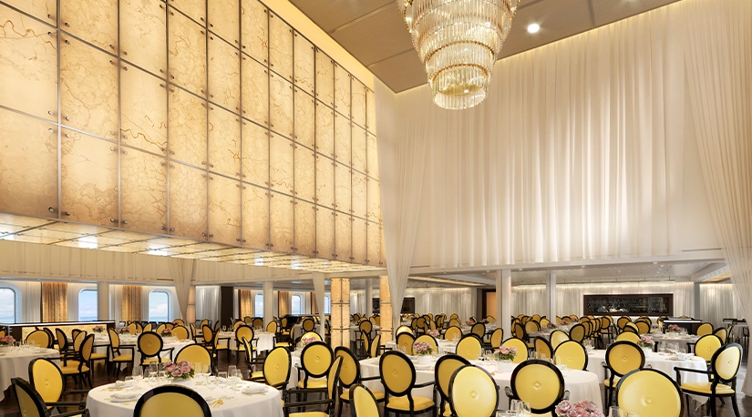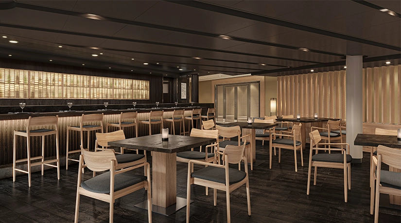 季節と寄港地の恵みを活かしたテラス付きビュッフェレストラン。和食・洋食・アジア料理など、世界中を航海してきたシェフならではの豊かな食の数々をお楽しみいただけます。お好みの量や味に合わせて、目の前で調理するライブキッチンも開催。刻々と移ろいゆく景色を眺めながら、自分だけの贅沢な一皿をどうぞ。