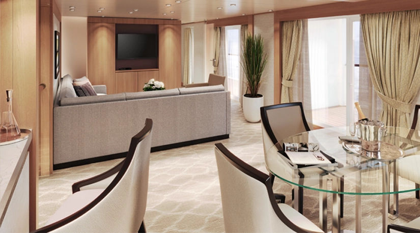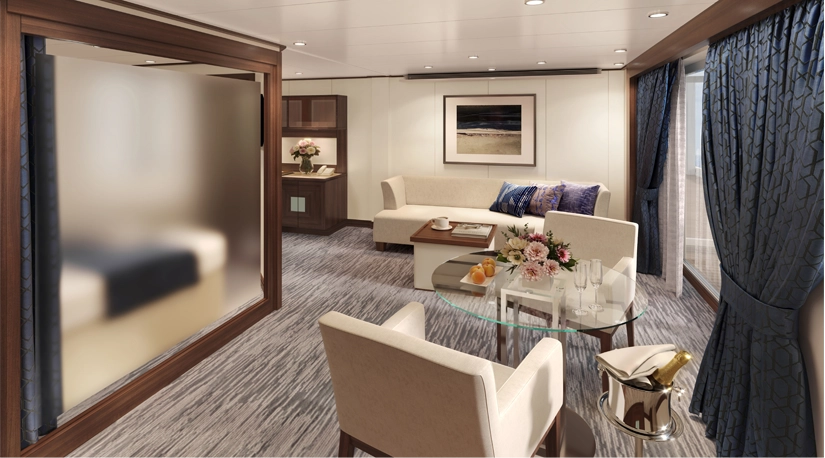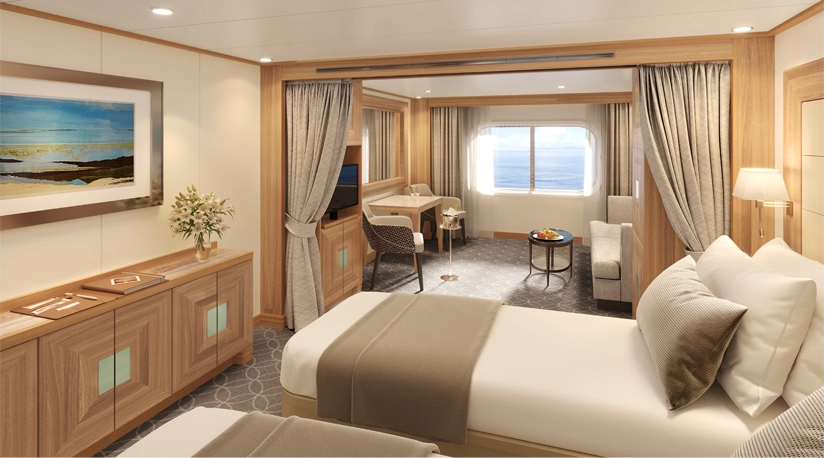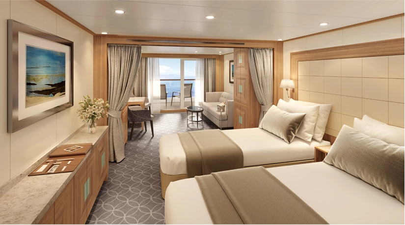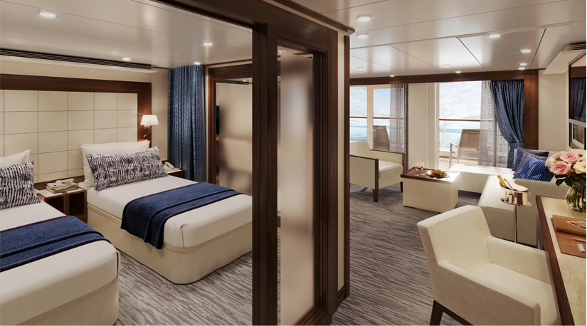 船首に面した大きな窓と屋外ベランダが特徴のプレミアムな客室。随一の客室面積を誇ります。